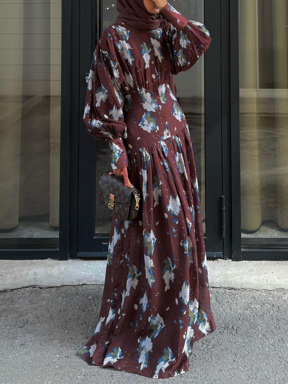 Burgundy Floral Print Elegant Maxi Dress