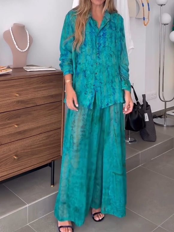 Turquoise Tie-dye Shirt And Wide-leg Pants Two-piece Set